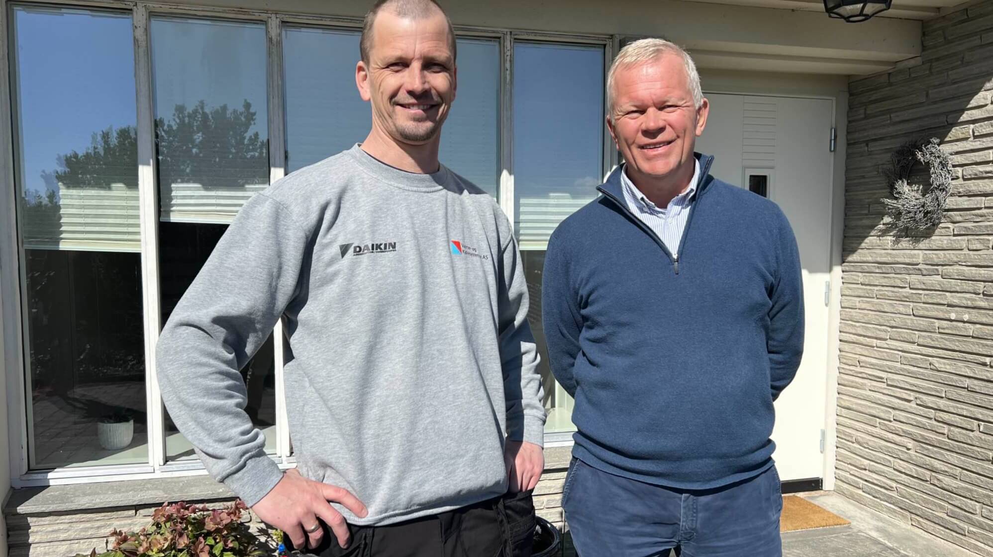 Teknisk leder Carl Basberg i Varme- og kjølesystemer (til venstre) med Ole Lindseth, som er svært fornøyd med sitt bergvarmeanlegg. Foto: Norsk Varmepumpeforening.