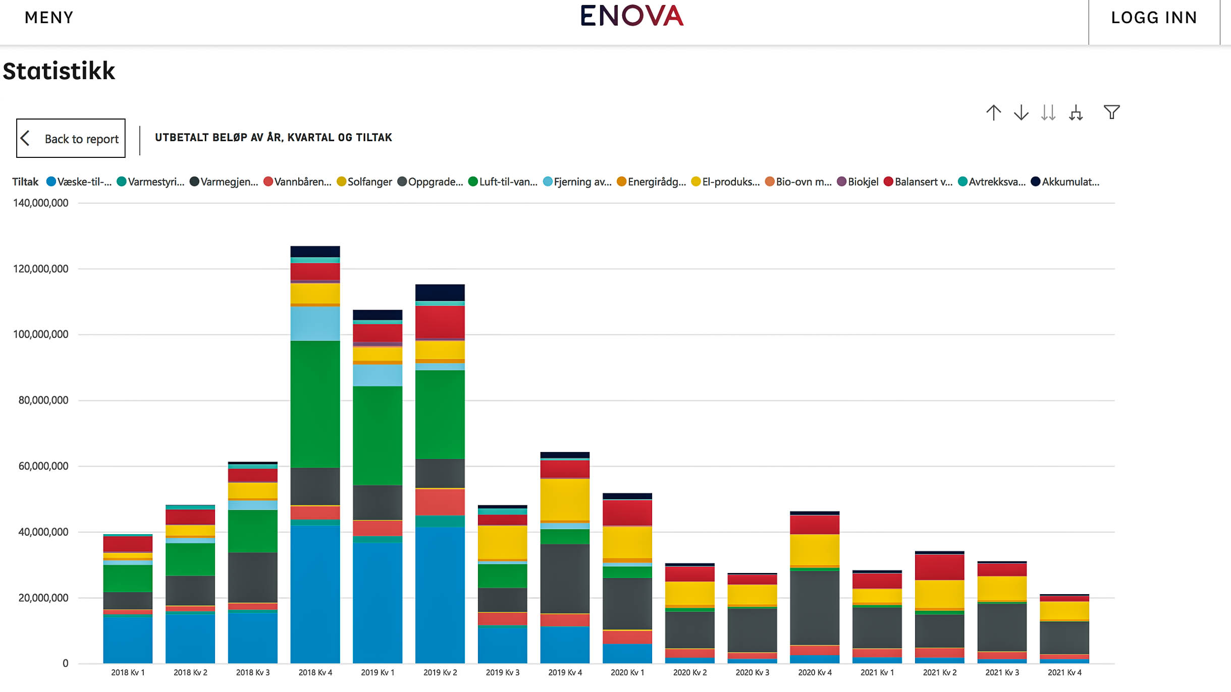 Enovas egen oversikt viser nedgangen i støtte til husholdningene. (Tallene viser utbetalt beløp kvartal for kvartal fra 2018). Kilde: Enova.no