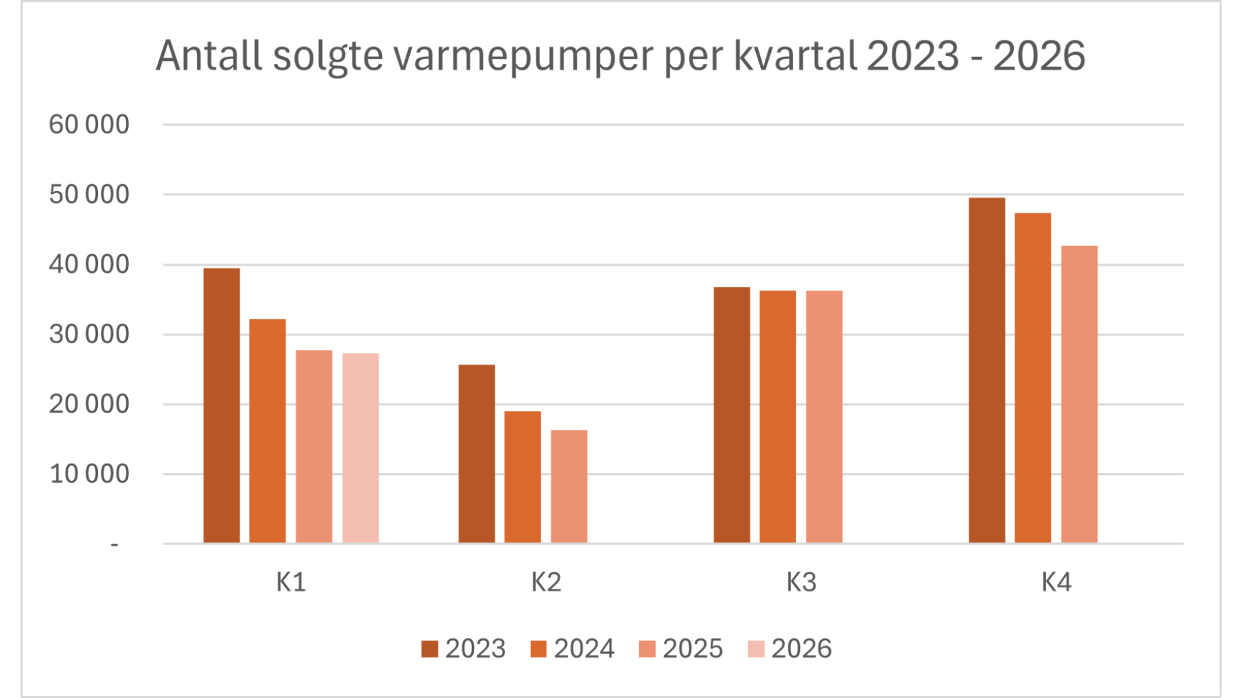 Statistikk fra Norsk Varmepumpeforening og Prognosesenteret for første kvartal 2026 viser at trenden fra 2025 fortsetter. Norgespris demper investeringsviljen i norske husholdninger, samtidig som interessen øker i næringsliv og industri.