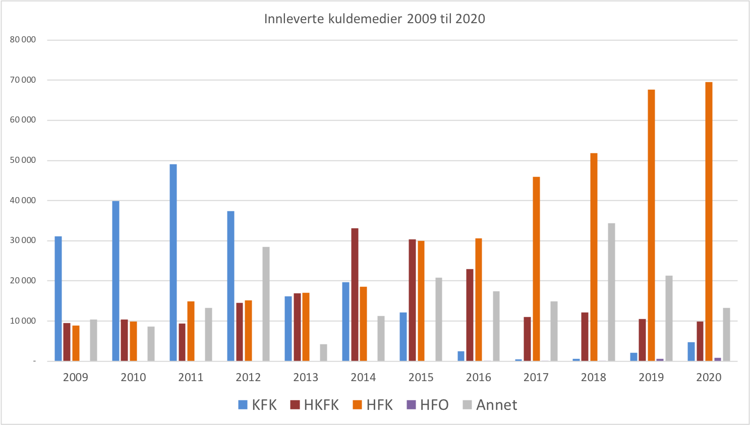 Mengde innleverte kuldemedier fordelte seg i fjor slik: