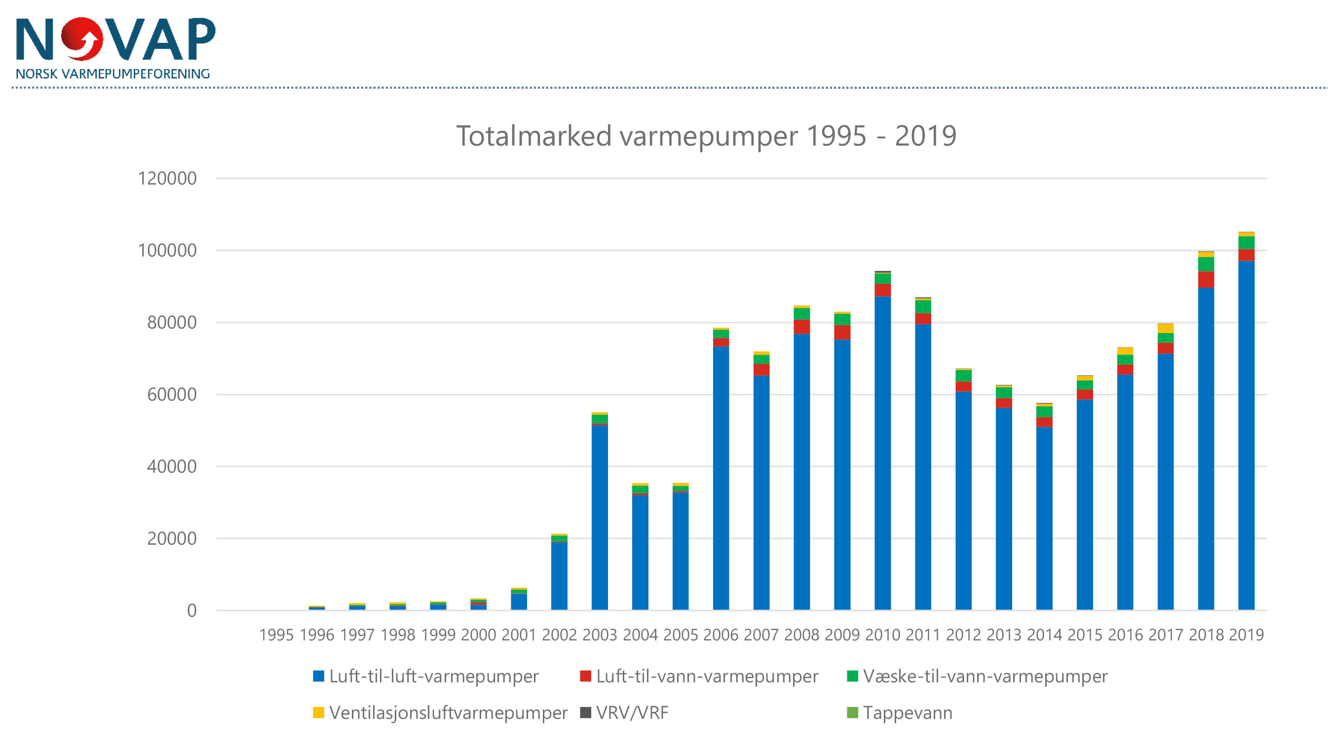 – For første gang passerte vi 100 000 solgte varmepumper – det er ganske sterkt, mener Hagemoen. Salget av luft-til-luft-varmepumper økte 8 %, mens luft-til-vann- og væske-til-vann-varmepumper gikk ned sammenlignet med 2018.