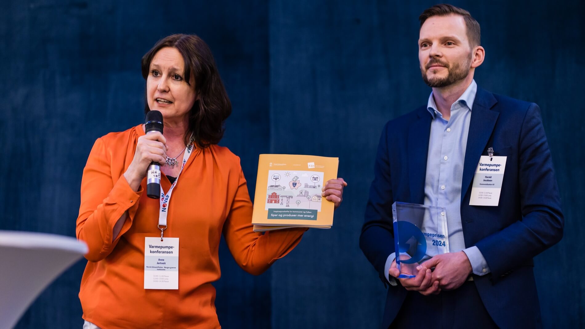 Anne Jortveit i Norsk Klimastiftelse med Harald Jabobsen fra prisvinner Kommunalbanken. Foto: Thomas Eckhoff for Norsk Varmepumpeforening.
